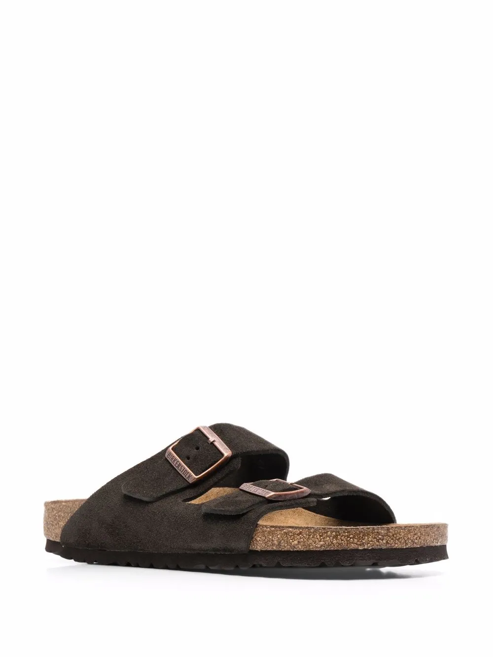 Mocha brown leather Arizona double-strap suede slipes from BIRKENSTOCK featuring open toe, slip-on style, branded insole and flat sole.