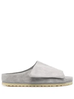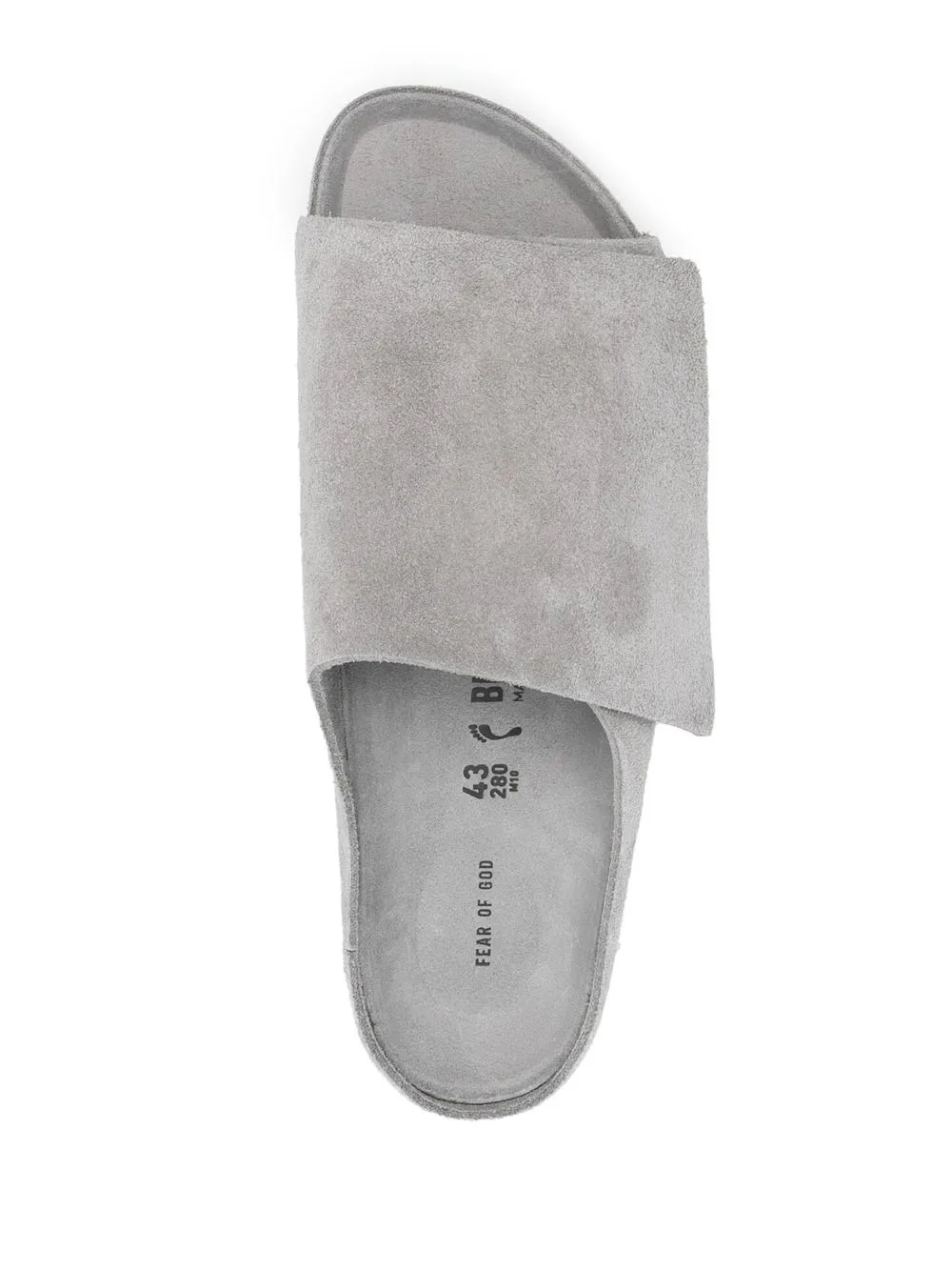open toe suede slides from FEAR OF GOD featuring grey, calf suede, debossed logo to the side, open toe, almond toe, open back, branded insole and flat rubber sole.