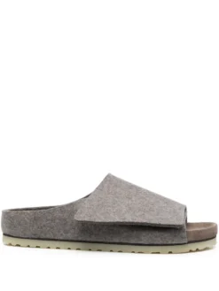 single-strap slides from BIRKENSTOCK featuring ash grey, wool, slip-on style, open toe and flat rubber sole.