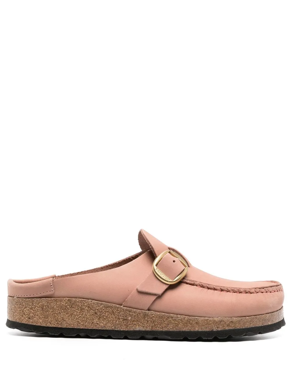 Arizona buckled mules from BIRKENSTOCK featuring calf leather, side buckle fastening, gold-tone hardware, adjustable fit, moulded footbed, slip-on style and old rose.