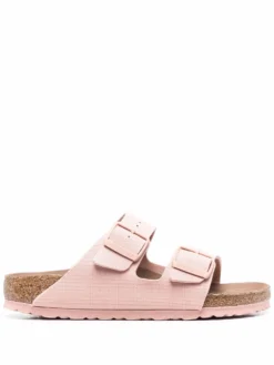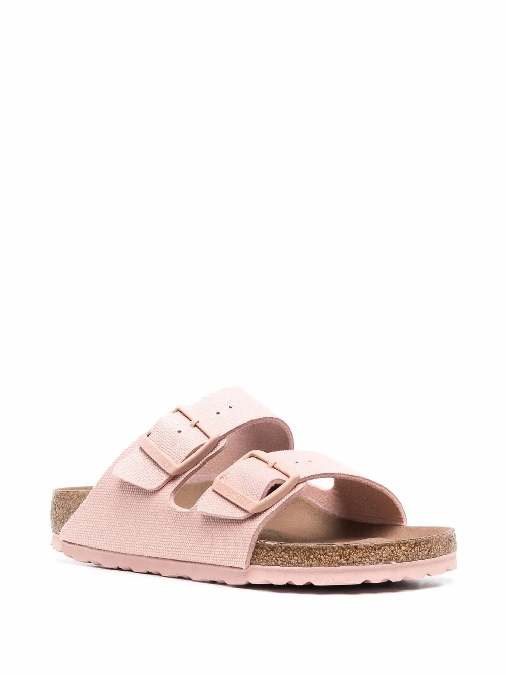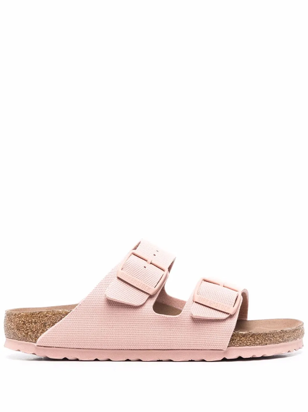Soft pink Arizona double-strap sandals from BIRKENSTOCK featuring double-strap design, buckle fastening, adjustable fit, open toe, moulded footbed and ridged rubber sole.