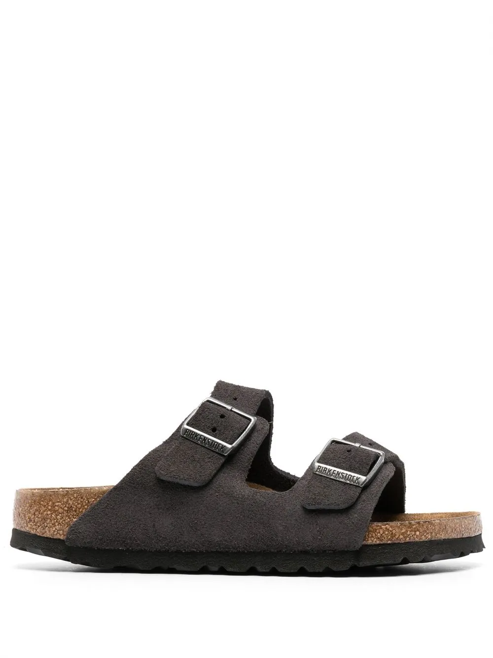 Arizona leather buckle-detail sandals from BIRKENSTOCK featuring charcoal grey, calf leather, silver-tone hardware, embossed logo to the side, side buckle fastening, branded insole, moulded footbed, flat rubber sole and slip-on style.