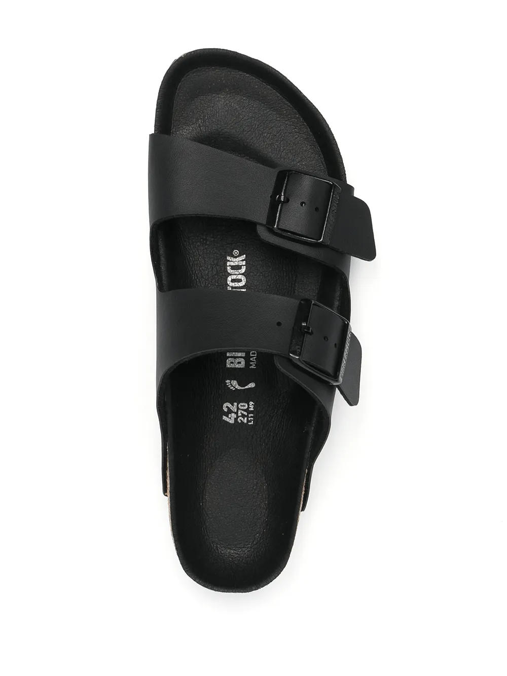 Black Birko-Flor® Arizona two-strap sandals from BIRKENSTOCK featuring tonal design, open toe, double buckle fastening, moulded footbed, cork sole and rubber outsole.