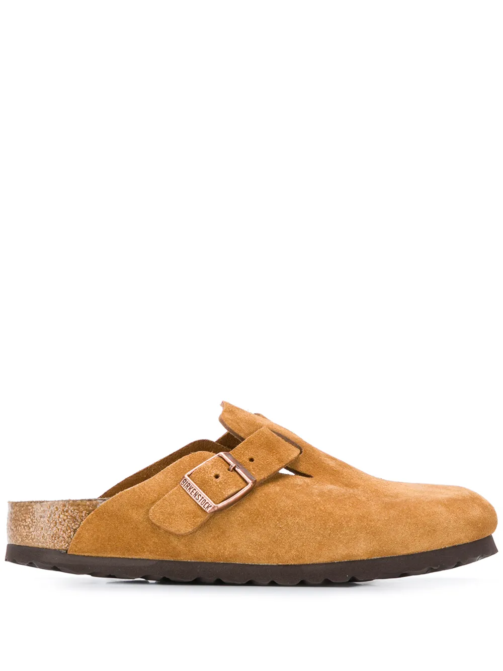 Brown Boston suede sandals from Birkenstock featuring suede panels, a round toe, a front buckle fastening, a side embossed logo stamp, a slip-on style and a ridged rubber sole.