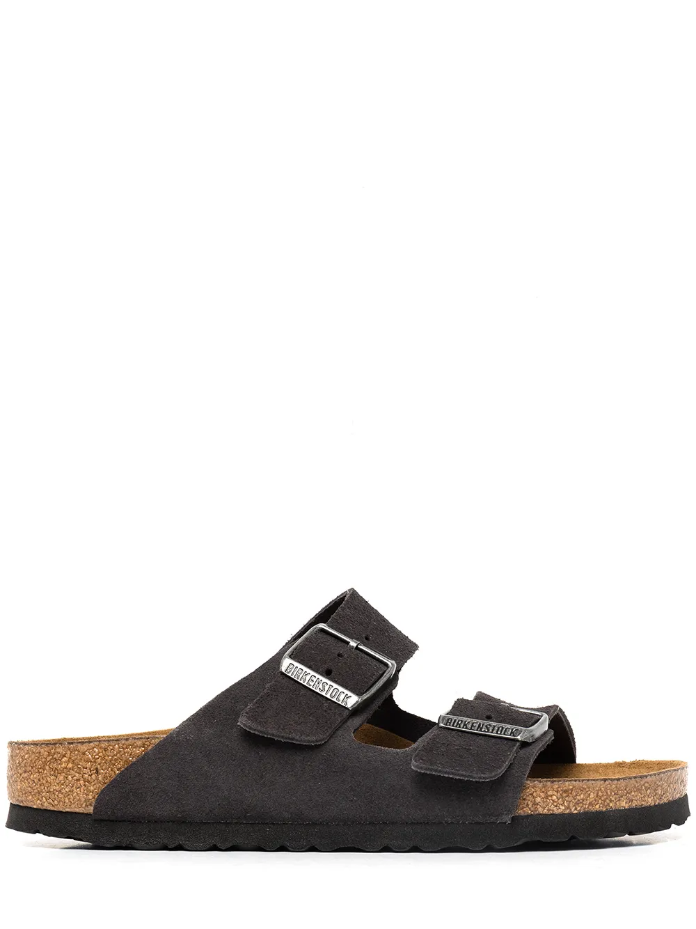 buckle-fastened sandals from BIRKENSTOCK featuring grey, leather, side buckle fastening, slip-on style, open toe, flat sole and branded insole.