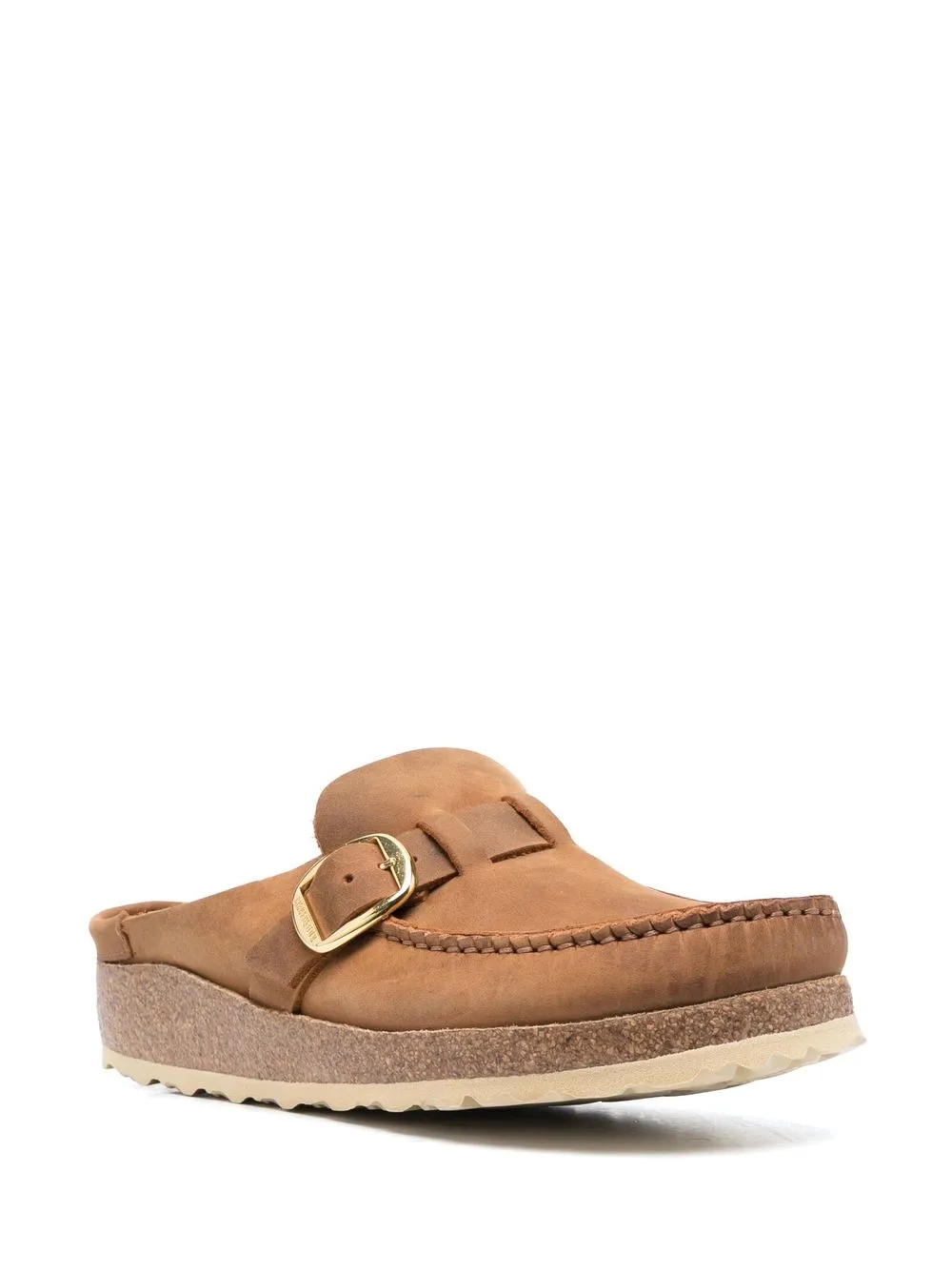 Buckley 30mm mules from BIRKENSTOCK featuring cognac brown, calf suede, round toe, buckle detail at the toe, backless, moulded footbed and rubber outsole.