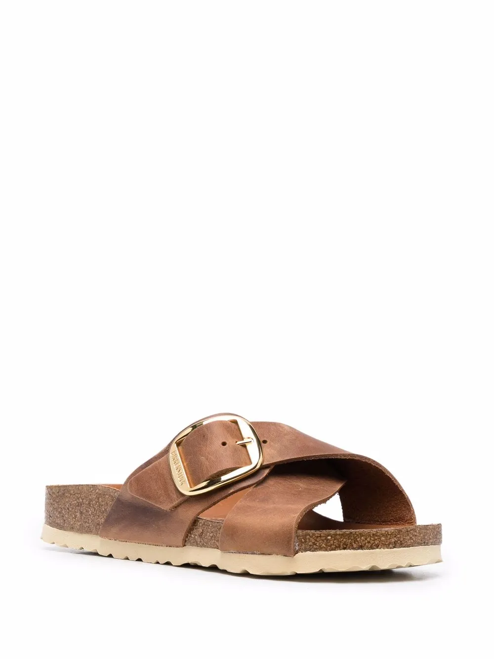 Brown leather cross-strap sandals from BIRKENSTOCK featuring crossover strap at the toe, side buckle fastening, moulded footbed and open toe.
