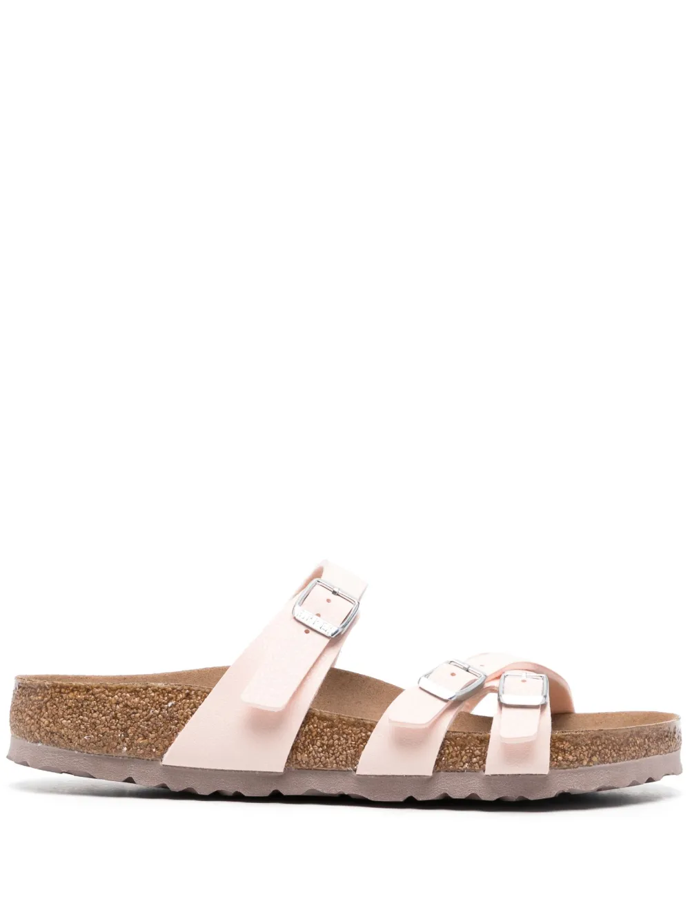 Franca buckle-fasteing slides from BIRKENSTOCK featuring light pink, logo-engraved buckle, open toe, open back, crossover strap at the toe, buckle fastening, branded footbed, flat rubber sole and slip-on style.