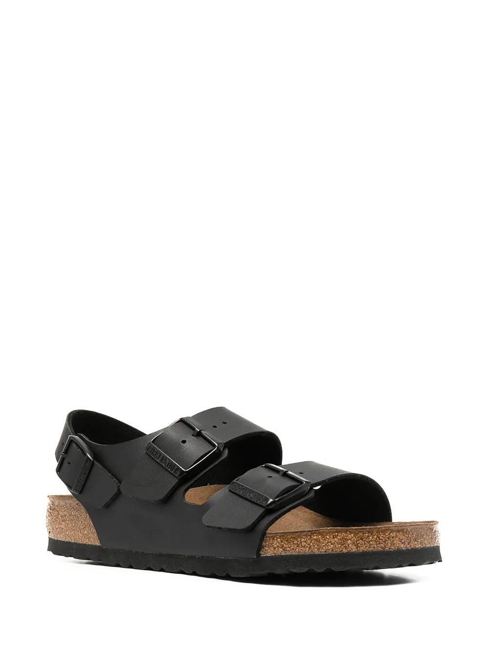 Black leather/suede Milano slingback sandals from BIRKENSTOCK featuring double buckle fastening, buckle-fastening slingback strap, moulded footbed and flat rubber sole.