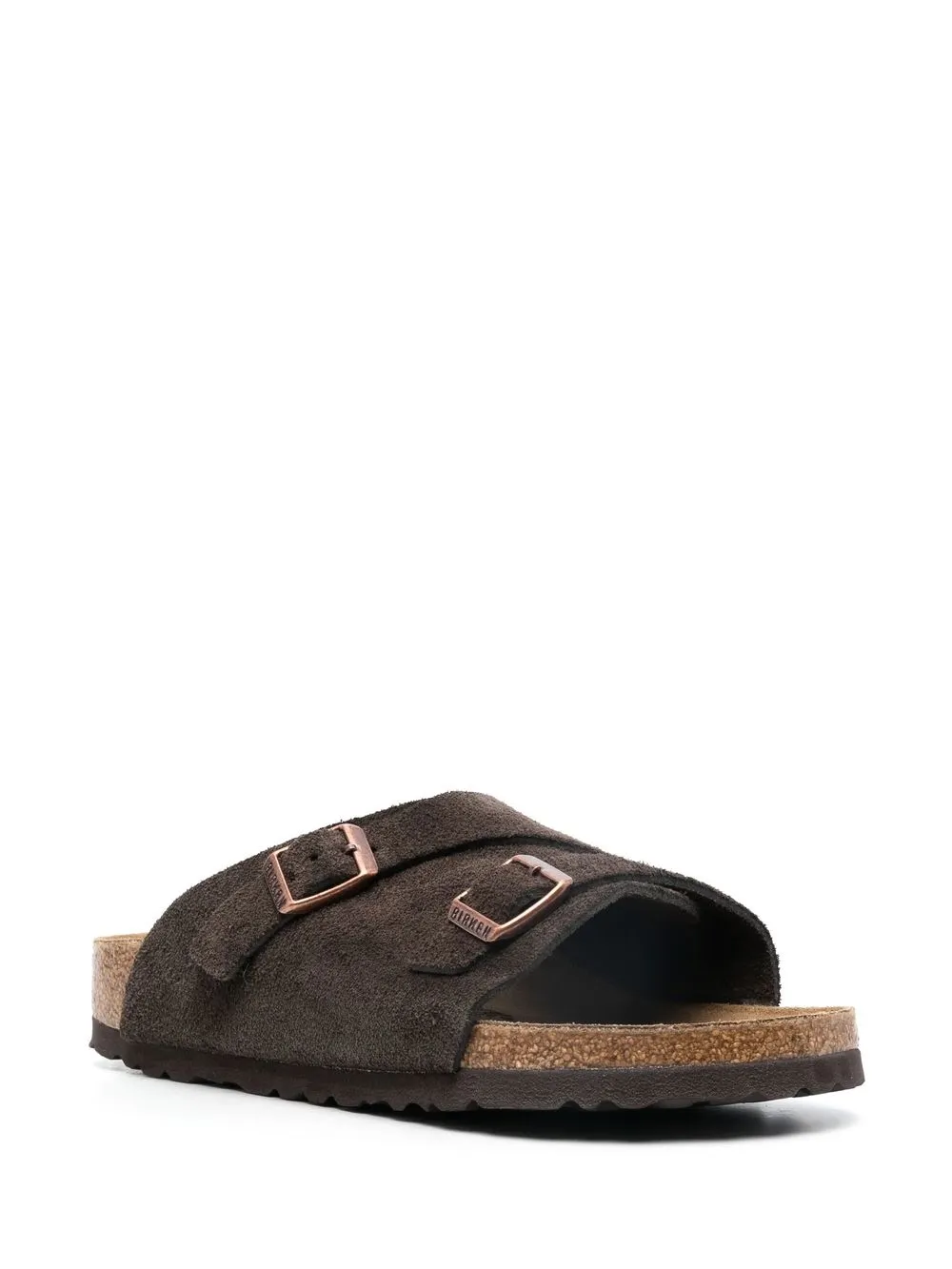 Zürich buckled 35mm slides from BIRKENSTOCK featuring coffee brown, calf suede, open toe, double buckle fastening, moulded footbed and rubber outsole.